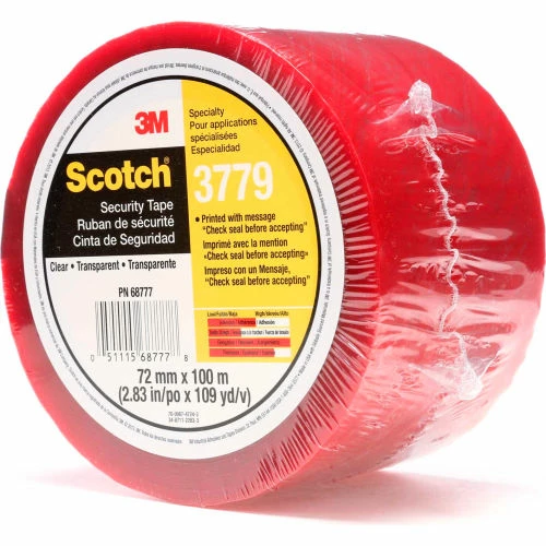 Scotch® Security Message Box Sealing Tape 3779 is a 1.9 mil industrial grade polypropylene film packaging tape with a synthetic rubber adhesive that offers roll to roll consistency to increase productivity for improved unit cost. It is specifically designed for flexibility and conformability under stress and is ideal for general industrial applications. It is easy to unwind and dispense with manual dispensers or the 3M-Matic Case Sealers. This tape resists abrasion, moisture, chemicals and scuffing for long-lasting performance. It is a clear tape with bold, red type that reads: CHECK SEAL BEFORE ACCEPTING.