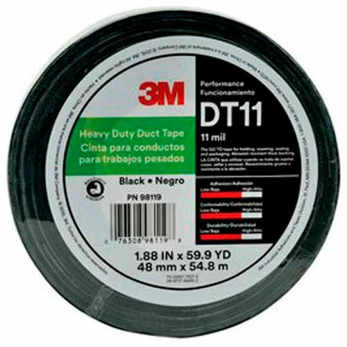 3M™ Heavy Duty DT11 is an 11 mil duct tape available in both black and silver with a synthetic rubber adhesive and water-resistant polyethylene backing and offers easy tear and conformability. The synthetic rubber adhesive makes it a great choice in holding, seaming, sealing and packaging. Thick backing offers additional abrasion resistance for the most demanding duct tape applications. Conveniently packaged in individual wrapped rolls preserves integrity of the roll for less waste.