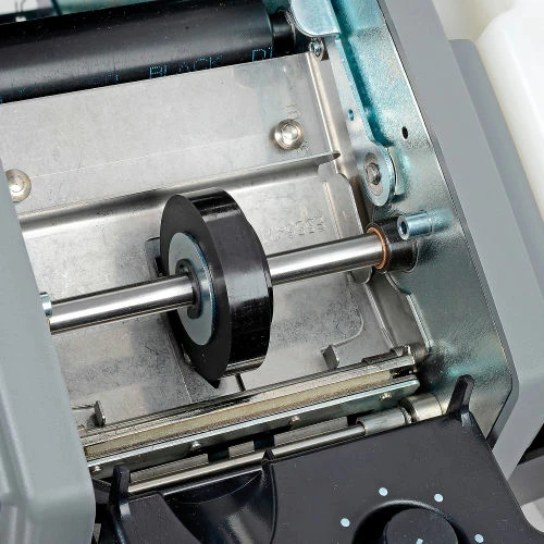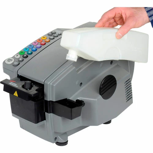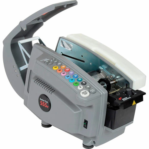 This electric tape dispenser dispenses 1/2″ to 3″ wide reinforced or paper tape and holds up to 1000’L rolls for reduced downtime. Adjustable top heater and advanced brush wetting system ensure adhesion. Color coded programmable keys set tape lengths up to 120″L at -1/2″ increments. Random length key allows tape to be dispensed at any length. Heavy duty self oiling blades for consistent cutting. It includes an RS232 port for PCs or printers and an automatic tape feed option. The dispenser meets FCC, UL, CE and CSA requirements. This product has a 2-year limited warranty.