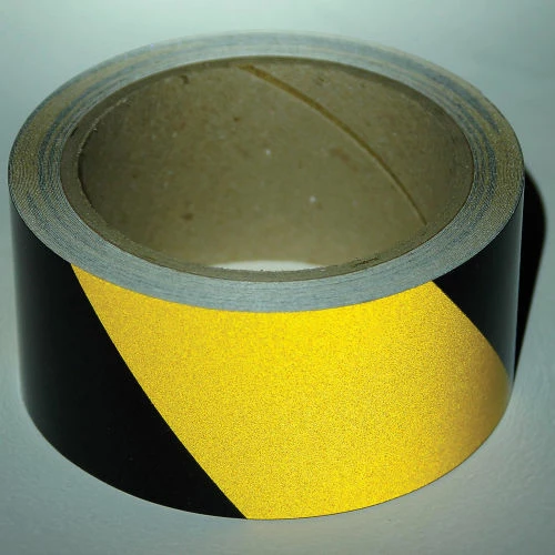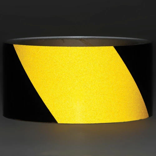 Pressure sensitive adhesive tape is impervious to weather, temperature and abrasion. Easy to apply. Sticks to any clean, dry surface: concrete, wood, metal, paint, etc. Section off aisles, lanes and safety areas. Eye-catching solution to help identify potential hazardous areas. Use on fire doors, handrails, electrical equipment, low beams, loading docks, warehouse floors, etc. Reflective warning tapes are 10 yd. Rolls. Helps you meet OSHA requirements.