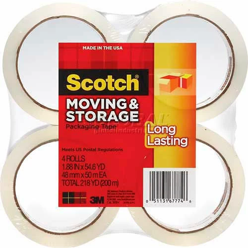 Scotch® Long Lasting Moving and Storage Packaging Tape 3650-4 is suitable for sealing boxes during your move or in storage. It features a long-lasting adhesive that works in hot or cold temperatures. Includes four rolls of tape – 48mm x 50m each.
