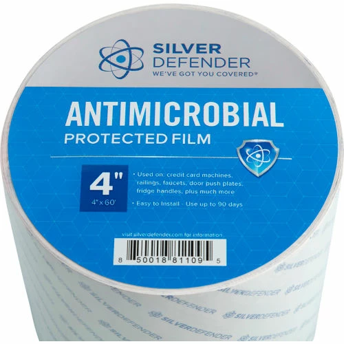 4″ x 60′ Roll of Tape for use on credit card machines, railings, faucets, door push plates, fridge handles, plus much more. This film contains an antimicrobial agent to protect the film from bacteria, mold, mildew and fungi to ensure the surface is clean. Silver ions react with and affect multiple sites in bacterial cells on the surface of the film, to keep the film clean. Developed for high traffic areas, Silver Defender’s stretchable film can cover any type of surface. This film is water proof and resistant to most cleaning products. Applied and removed in seconds, use up to 90 days. Can be used indoor or outdoor.